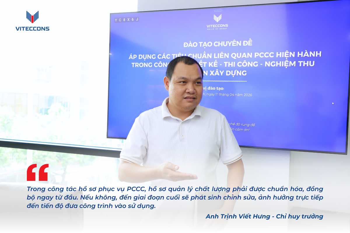 Nhằm tăng cường năng lực chuyên môn và đảm bảo tuân thủ đầy đủ các quy định pháp luật trong hoạt động xây dựng, sáng ngày 11/04/2026, tại trụ sở chính công ty, Viteccons đã tổ chức chương trình đào tạo chuyên đề: “Áp dụng các Tiêu chuẩn liên quan PCCC hiện hành trong công tác thiết kế – thi công – nghiệm thu dự án xây dựng.”